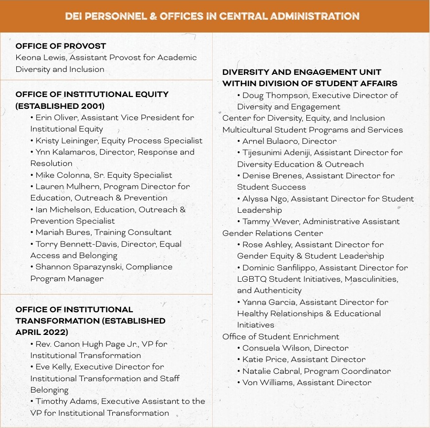 Notre Dame has more than two dozen central administrators dedicated to promoting DEI. Equity is an overriding concern (the Office of Institutional Equity has nine employees), though the Office of Institutional Transformation (OIT), the newest office, has five employees as well. In addition, Notre Dame’s colleges and schools have twelve DEI administrators in total. Many departments have DEI directors as well. Notre Dame spends more than $6 million on DEI personnel across the university.