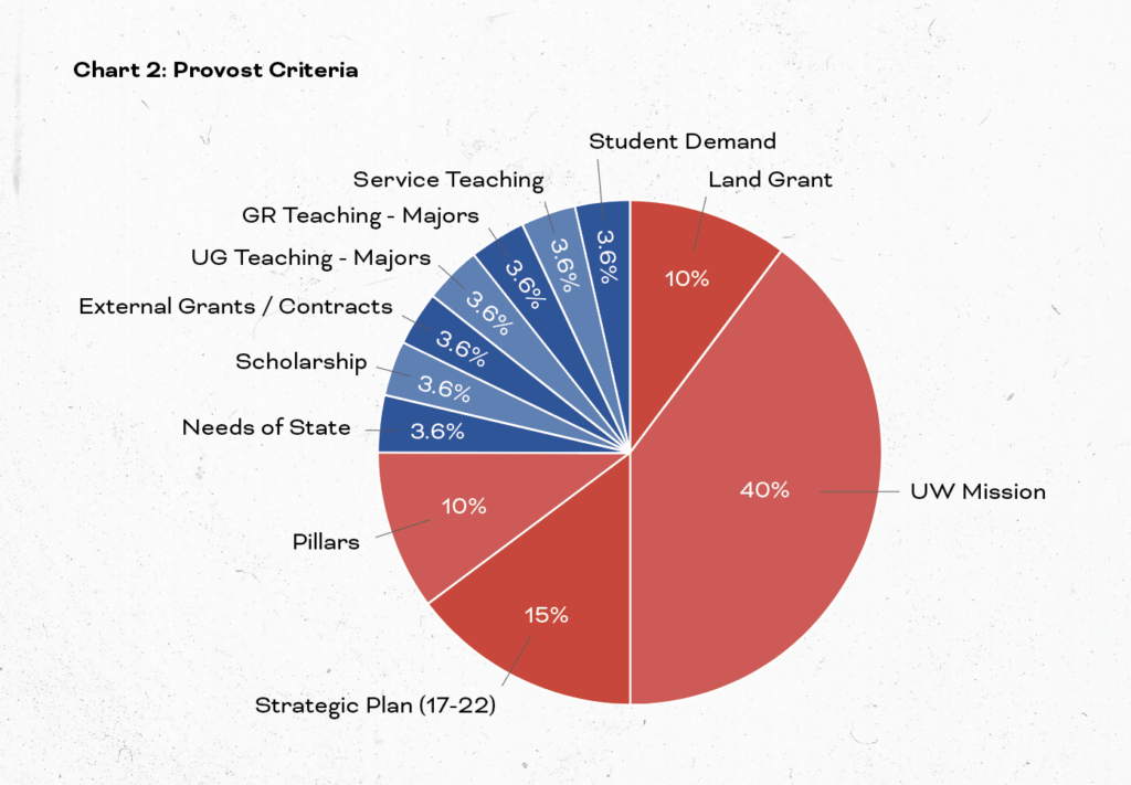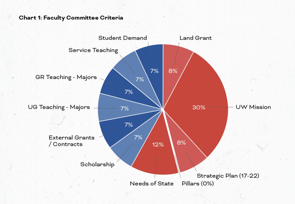UW’s 2-13 was invoked in 2021 when the university faced a significant deficit owing partly to persistent enrollment declines. As the program review was underway in 2021, a faculty committee judged UW’s programs, as did the provost’s office independently. The two committees had distinct criteria for evaluating UW programs, as depicted in charts 1 and 2. Most of the criteria for judging programs were mission-based. Among these criteria, department or degree programs were judged on how they served the “UW mission” (about 30 percent of the total for the faculty committee and 40 percent for the provost), whether they met the “needs of the state” (12 percent for faculty, about 4 percent for provost), and whether they served the strategic plan (provost 15 percent). These inherently political judgments, depicted in red, officially constituted about 50 percent of the program evaluation points for the faculty committee and nearly 70 percent for the provost evaluation. Mission matters.